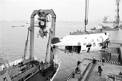 11月23日,“蛟龙”号载人深潜器被缓缓吊起安装在母船“向阳红09”船的支架上。