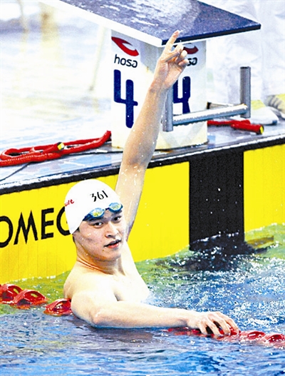 图为5月17日,浙江队选手孙杨在全国游泳冠军赛暨亚运会选拔赛男子1500自由泳决赛后庆祝胜利。 新华社记者 朱峥 摄