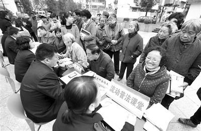 11月27日,在合肥市铜陵路街道的“流动普法课堂”上,“普法志愿服务队”队员为社区居民提供免费法律咨询及援助。