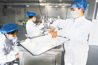 11月26日,兰州九州主食厨房车间内工人们正在加工馒头。