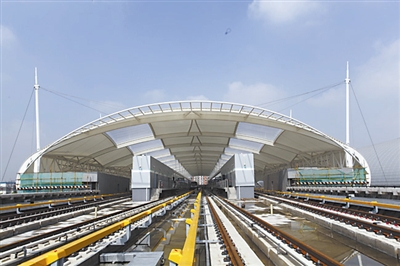 目前国内轨道交通高架车站中面积最大的钢结构索膜工程——上海轨道交通11#线南段龙阳路高架车站钢结构雨棚工程,近日完成施工。该雨棚为钢拱加索膜结构,屋面材料为PTFE及ETFE两种膜材配合使用,兼具采光、避雨等多种功能。