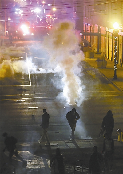 25日,美国密苏里州弗格森,警察投掷催泪弹驱散示威者。 东方IC供图