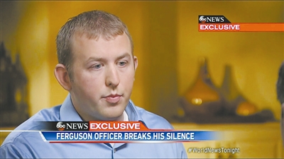 (视频截图)弗格森涉案警员威尔逊于当地时间25日首度在电视上露面,就这起案件接受美国广播公司(ABC)的专访。CFP 供图