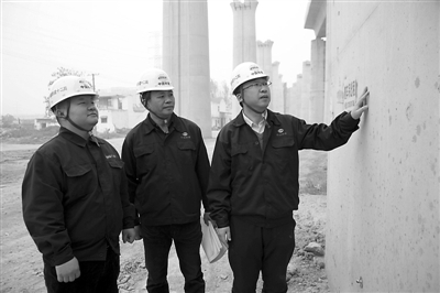 赵常煜(最右)带领技术质量检查小组人员对正在施工的郑 (州)徐(州)高铁工程进行检查 。