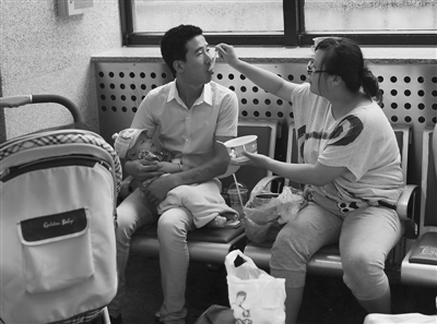 这是8月5日,记者在北京西客站第九候车大厅抓拍的一个瞬间。开始时,画面中的孩子是由妻子抱着的,一手推着童车,一手提着行李的丈夫经过了排队后终于等到了两个座位。一家人刚坐下丈夫就从妻子手中接过了孩子,看样子是让妻子休息一会。而妻子腾出双手之后便立即忙活着泡了一盒方便面,过了一会,她自己一口,丈夫一口的吃了起来!