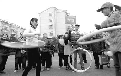 11月30日,一名残疾人(前左)与志愿者比赛转呼啦圈。
