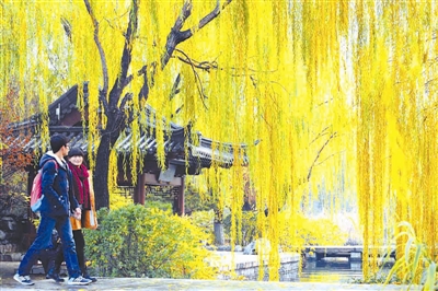 初冬时节,大明湖畔柳丝如金色垂帘,将泉城济南装点得分外娇艳。