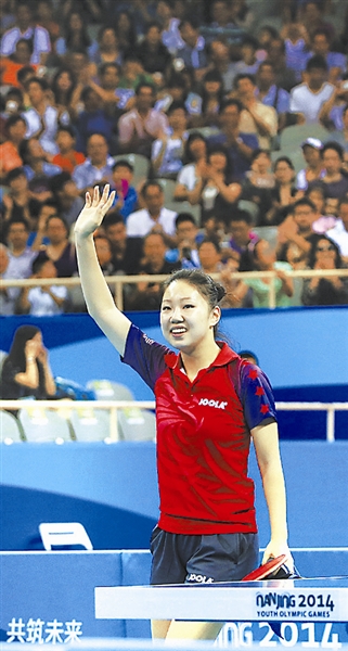美籍华人张安曾在今年8月的南京青奥会上获得女单铜牌。图为张安在获胜后庆祝。本报记者 郎成 摄