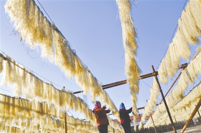 12月1日,山东省沂源县鲁村镇泉子官庄村的农家妇女在晾晒加工的粉条。