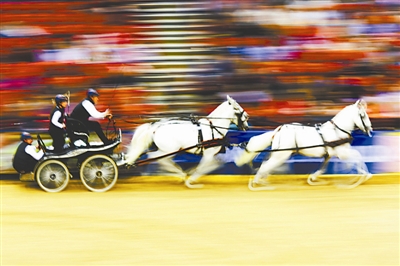 11月30日,2014-2015赛季国际马术联合会马车世界杯匈牙利站,荷兰车手查尔顿和他的车队在比赛中。  新华社发 (弗尔季·奥蒂洛 摄)