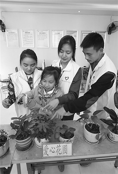 据了解,西海岸菜市场现有商户1200余家共计100余名孩子,他们大都正读小学、初中、高中。71岁的党员志愿者王辉荣提议在市场里建一个书屋。她的提议得到了有关部门的大力支持。图为2014年在四川省攀枝花市西海岸菜市场“六点半学校”内,青年志愿者利用周末时间教攀枝花外来务工人员子女培育盆花。王川源/CFP
