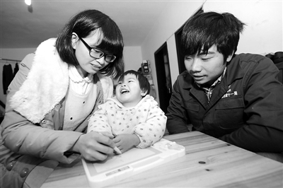 难得一见的张良剑和曹金香在临时租住的房屋里和女儿做游戏(12月3日摄)。