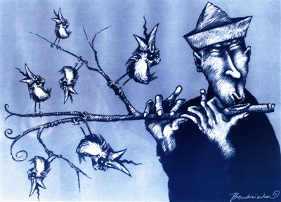 长笛演奏妙趣无穷,招来飞禽引吭高歌。画面上乐器和鸟儿的夸张和变形,更凸显了大自然中一派和谐与温馨。本兹查
