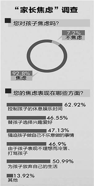 人民网强国论坛开展的一项调查显示,在有子女的被调查者中,92.8%的家长认为自己对孩子的成长、教育存在焦虑。而在全部被调查者中,98.6%的人认为身边有家长存在焦虑现象。