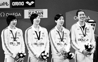 12月3日,中国选手(从左至右)邱钰涵、曹玥、郭君君和沈铎在颁奖仪式上。当日,在卡塔尔多哈拉开帷幕的2014年世界短池游泳锦标赛女子4x200米自由泳接力比赛中,由邱钰涵、曹玥、郭君君和沈铎组成的中国队以7分37秒02的成绩获得银牌。新华社记者 周欣 摄