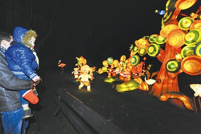 12月6日,在比利时安特卫普动物园,游客参观中国花灯展。