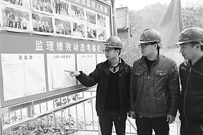 河南大地路桥监理公司209国道总监办,在严格标准监督施工队伍,把辖区内线路建设成文明路、生态路、安全路、精品路的同时,对所辖4个驻地办坚持监理原则公开、监理姓名公开、监理权责公开、监理绩效公开和监督监理方式公开等五公开制度,自觉把监理工作置于监理对象和社会公众监督之下。图为李自光(左一)总监在听取驻地监理办人员对绩效公开情况的意见。郑传海 摄