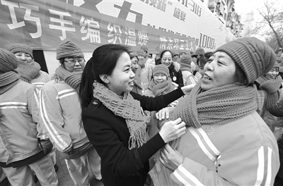 当日,河北省石家庄市妇联组织了“爱心编织温暖 情系环卫工人”志愿服务活动,志愿者们将亲手编织的爱心围巾、帽子系在“城市美容师”身上。图为“80后”志愿者为环卫工阿姨戴上围巾。