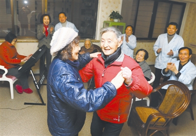 12月10日,唐盛武老人(前右)和老伴在养老院的活动室内跳舞。