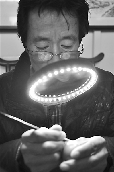 53岁的姜忠海是山东日照市东港区许家楼村人,经营酒水生意。2005年,他从报纸上看到几幅蛋雕作品后,产生了浓厚兴趣。近10年来,他利用业余时间研究蛋雕技艺,创作了花卉、十二生肖、福字等蛋雕作品,在小小的蛋壳上创造出大千世界。刘明照/CFP