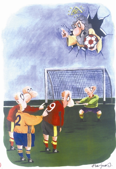 绿茵场上,前锋队员踢了“高射炮”,足球闯进上帝的家门。为此,不仅受到了主人的谴责,“臭脚”更受到队友们的奚落。【伊朗】阿里沙赫米