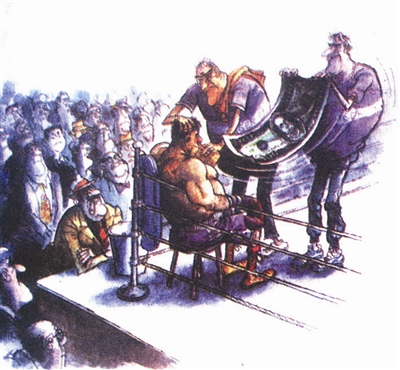 金钱往往能刺激运动员夺“标”。看,坐在赛台一角喘气的拳击手已被美元大钞“煽”得跃跃欲试,发誓把对手打得满地找牙……【巴西】科诺尔