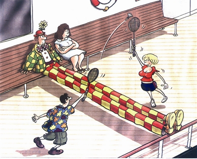 身体超重的运动员即将跳水,看台上的观众见势而逃……这幅画不高明的构思牵强“搞笑”,低俗的噱头更难引人会心而笑。【波兰】哈吉诺斯