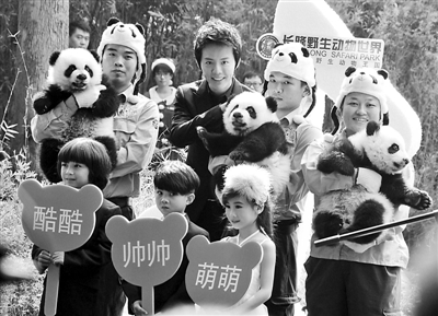 12月15日,被授予“熊猫爱心大使”的李云迪(后左二)与工作人员怀抱中的大熊猫三胞胎“萌萌”“帅帅”“酷酷”合影。当日,广州长隆野生动物世界举行活动,对外公布大熊猫三胞胎的名字,大姐叫“萌萌”,二弟叫“帅帅”,三弟叫“酷酷”。