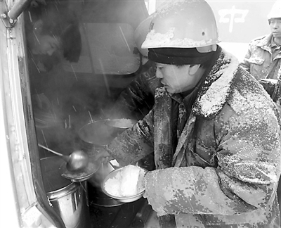 12月15日,沈阳又迎来新一轮的降温天气,密密麻麻的雪花飘落在地,气温直降到零下20摄氏度,路上的积雪影响市民出行。 图为沈阳一工地农民工兄弟在雪中打饭。李浩/CFP