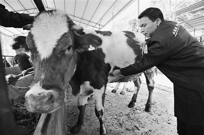 近年来,地处桂北的广西柳州市融安县积极发展“生态养牛”产业,通过“公司+基地+农户”生产模式,推广“养牛—沼气—发电—甘蔗(果树)”等生态养殖模式,控制畜禽养殖对环境的污染,实现农民增收和环境保护的“双丰收”。图为在融安县宏康生态养殖场,一名技术员在检查牛的健康状况。周家志 摄(新华社发)