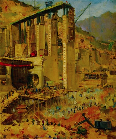 新安江大坝建设工地 (油画)胡善馀
