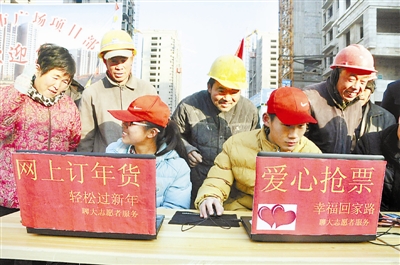 12月21日,山东聊城大学志愿者服务队来到聊城市一建筑工地设立农民工订票服务点,安排志愿者为在工地忙碌的外地农民工提供网络、电话预定火车票服务,并根据他们的需要在网上订购年货和物品,方便他们春节前顺利返乡。 赵玉国 摄/CFP