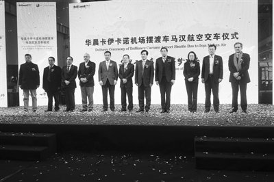 这一天上午,华晨卡伊卡诺机场摆渡车伊朗马汉航空交车仪式在大连华晨汽车产业园举行。华晨集团董事长、总裁祁玉民、马汉航空董事、副总裁Malakoitipour、华晨卡伊卡诺公司总经理Mario Conde、华晨汽车集团总裁助理、大连投资公司总裁池冶先生等出席了交车仪式。