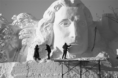 12月20日,哈尔滨太阳岛上雪雕博览会的雕塑制作已近尾声,精美的雪雕吸引来了中外游客。