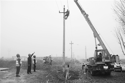 现场负责人胡舒程正在指挥吊车拔出电杆。“起,起,停!”因下雨后电杆表面比较湿滑,缠在电杆上端的起吊麻绳随着吊车用力开始滑动,胡舒程赶紧叫停。施工人员王强立即登杆,用抹布擦拭电杆,并缠上一层抹布,然后套上麻绳。这次起吊比较顺利,电杆拔出后避开空中的导线,缓缓移动到新挖的杆坑上方,稳稳落到杆坑里。挖掘机立即开始填土。胡舒程站在电杆东侧,比对着远处成行的电杆,指挥吊车司机:“向南,向南,慢!再向北!”填土完成后,王强登杆紧线。虽然在杆上紧线的时间也就10来分钟,但他下来后,立即摘下手套,使劲搓手并用嘴呵气,成串的水珠从安全帽上滑下。