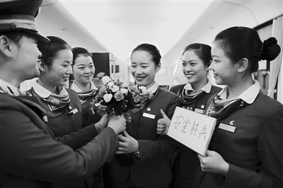 12月19日,南昌客运段Z133次井冈山号列车上,乘务员们在为刚当上安全标兵的小彭庆贺。春运即将来临,为更好地完成春运服务工作,南昌客运段开展了“劳动安全我做主”主题竞赛活动,每个季度都在班组中评选一名在安全生产工作中成绩优秀的同志担任安全标兵,最后推选到段进行表彰和奖励。 鲍赣生 摄