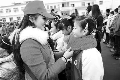 12月29日,大学生志愿者(左)为一名留守儿童戴上围巾。