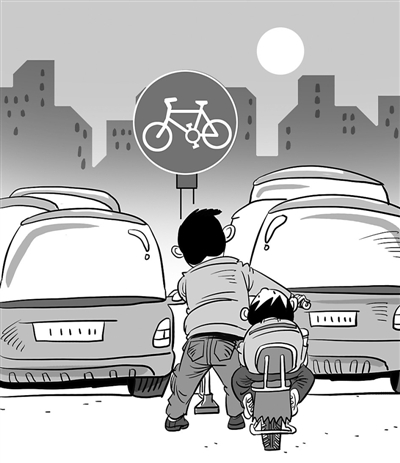 随着机动车数量的不断增加,自行车道被挤占的现象越来越明显,导致自行车道路通行环境越来越恶化。骑自行车既环保又锻炼身体的优点在一些地方失去了实现的基础。面对自行车道不断被蚕食的现状,我们不禁要问:自行车与机动车的通行权是否应有合理的规划?保证骑车人通行权是否有制度的保障?如果这些都没有,那么,鼓励公众骑自行车出行就成了一句“口是心非”的空话。□赵春青/图 小郭/文