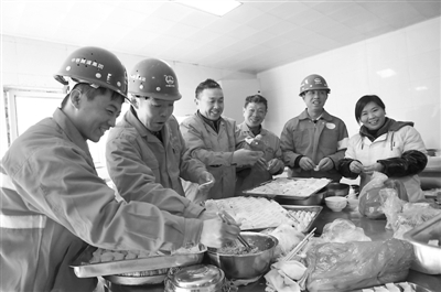 日前,河北省石家庄地铁一号线人民广场站项目工区,天气寒冷,施工困难,但工人仍坚持一线工作。中铁隧道集团把温暖送到工地,如图,工人们正在包饺子,其乐融融。赵晶 摄