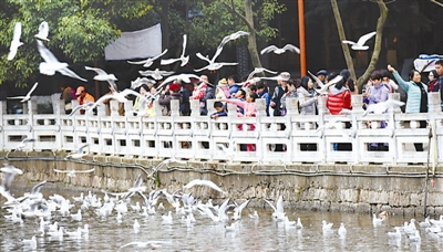 新年伊始,不少云南昆明市民和外地游客来到市内的翠湖公园、大观楼等地,与来自遥远西伯利亚的红嘴鸥嬉戏、玩耍。红嘴鸥是“春城”的“荣誉市民”,自1985年以来已经连续30年来到昆明越冬,成为当地冬春时节独特、靓丽的城市风景。 新华社记者 蔺以光 摄