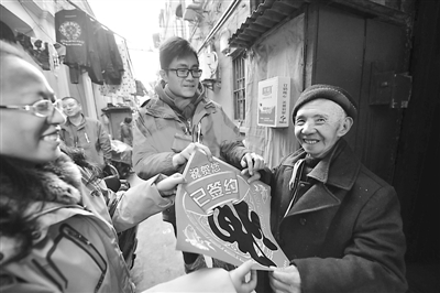 2014年12月30日,上海,84岁的孤老罗佑森从工作人员手中接过象征“已签约”的“福”字。当天,他成为上海虹口区158、161街坊首批旧改签约居民,嘉兴路街道工作人员特地将“福”字送到了他家中,以示祝贺和慰问。30年前,罗老伯只身一人搬到了虹口区嘉兴路街道江夏里,在仅仅6平方米的空间里蜗居了30年。 现如今,终于盼来了旧改征收,罗老伯的喜悦之情难以言喻。沈春琛/CFP