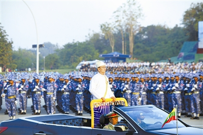 1月4日,在缅甸内比都,缅甸总统吴登盛(中)在阅兵仪式上检阅士兵。
