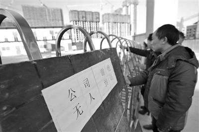 工友们在工地项目部外寻人讨要说法,但工地的项目部外已经悬挂起了“公司无人 谢绝到访”的告示牌。新华社记者 彭昭之 摄
