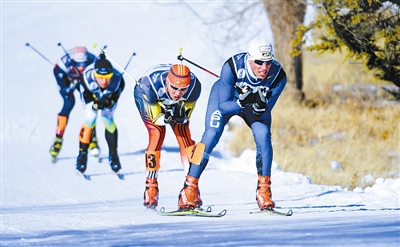 1月5日,2015年国际雪联越野滑雪中国巡回赛西乌珠穆沁旗站比赛结束。在男子1.2公里自由式滑雪比赛中,美国选手彼得·克林(右一)获得冠军,中国选手孙清海(右二)获得亚军。