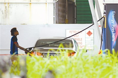 1月7日,一名工作人员在新加坡的加油站为汽车加油。