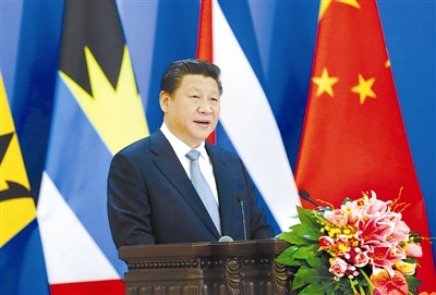习近平指出,拉美和加勒比是最具发展潜力的新兴地区之一,地区各国更加重视发展同包括中国在内的亚太各国友好合作关系,为中拉关系全面深入发展提供了更大空间。当前,中国人民正在为全面建成小康社会、实现中华民族伟大复兴的中国梦而奋斗,拉美和加勒比各国人民也在为实现团结协作、发展振兴的拉美梦而努力。共同的梦想和共同的追求,将中拉双方紧密联系在一起。中国坚持独立自主的和平外交政策,坚持走和平发展道路,坚持互利共赢的开放战略,坚持和积极践行正确义利观,讲信义、重情义、扬正义、树道义,愿将中国发展同广大发展中国家共同发展紧密结合起来,共同致力于建立以合作共赢为核心的新型国际关系。现在,中国经济发展进入了新常态,今后一个时期将继续保持中高速增长。这将给包括拉美和加勒比国家在内的世界各国提供更多市场机遇、增长机遇、投资机遇、合作机遇。我们要共同努力,实现10年内中拉贸易规模达到5000亿美元、中国在拉美地区直接投资存量达到2500亿美元的目标。