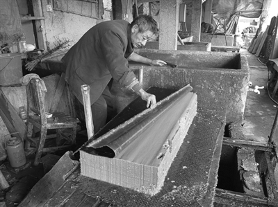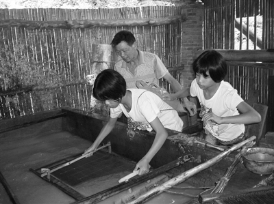 学生用自主研发的高镰把头镰架手工抄纸。罗理力 摄