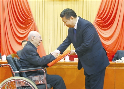中共中央总书记、国家主席、中央军委主席习近平向获得2014年度国家最高科学技术奖的中国科学院院士于敏颁奖。 新华社记者 马占成 摄