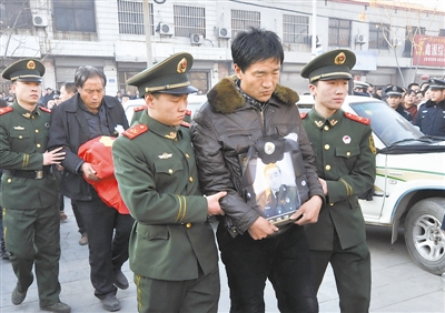1月10日,烈士张晓凯的亲人手捧张晓凯的遗像和骨灰走进沙河市烈士陵园。