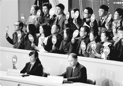 2015年1月7日晚8时,湖北武汉,电视问政第二场继续关注纠正和治理基层干部作风问题,6个新城区和武汉经济技术开发区、武汉化工区区委书记将走上问政台。图为:现场嘉宾对承诺人的发言举“哭脸”牌。东方IC/供图